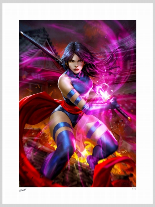 炎が轟く中、精神エネルギーを武器にまとわせる「サイロック」エリザベス・ブラドック。人気の90年代コスチュームを着たサイロックの周囲の気の流れまでを描いた、「DCWJ」デリック・チューのアート。サイドショーから限定でアートプリント化されました。