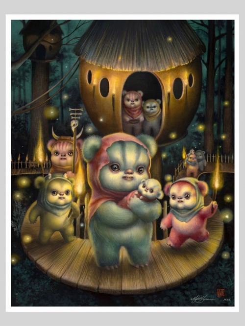 シュールレアリスムを得意とするマブ・グレイブスが描いた「It Takes an Ewok Village」。『スターウォーズ』史で文字通りマスコット的な立ち位置で人気のイウォーク、サイドショーのアートプリントとしてリリースされます。親イウォークに抱かれる子イウォーク、その周囲にも色とりどりのイウォークたちが集っています。それはイウォークの村。住居やライトなど生活感がありつつも、ファニーで不思議な世界観。お部屋に飾り、雰囲気を楽しみたいアートとなってします。