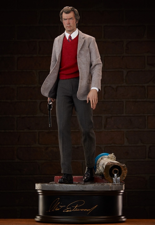 クリント・イーストウッドの代表作の一つ『ダーティハリー』シリーズ、その主人公ハリー・キャラハンがサイドショーからプレミアムフォーマットフィギュアとして再登場です!銀行強盗のシーンにて、犯人に対し「さあ、どうする?」と発した名シーン。そのシークエンスを凝縮して構成した、今回のスタチューは全高約58センチ。先にリリースされた1/6スケールでのフィギュア化で培った技術をフィードバックし、ジャケットからスラックス、印象的な赤いベストまでファブリックを用いての再現されました。ボタンからステッチまで丁寧な仕立てで、ジャケットの裾には「表情つけ」のためのワイヤー内蔵も。手には愛銃の44マグナム、足元には暴走車に破壊された消火栓。サイドショーの製作作業現場へ招かれたクリント・イーストウッドも、その製作陣の熱の入れように終始ご機嫌。そんな「お墨付き」の傑作スタチューを、ぜひコレクションへ。
