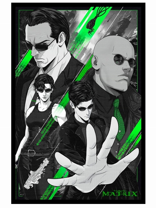 ラナ&リリー・ウォシャウスキー監督による『マトリックス』(1999年)の25周年を記念したアーティストのジョニー・カバジェロが描いたイラストがサイドショウによってアートプリント化!象徴的なオールブラックのアンサンブルとサングラスを身に着けたネオ、トリニティ、モーフィアスの3人がモノクロに描かれており、ネオングリーンのマトリックス・コードが存在感を放っています。『マトリックス』25周年に、オシャレなアートプリントを迎えてお祝いしましょう!