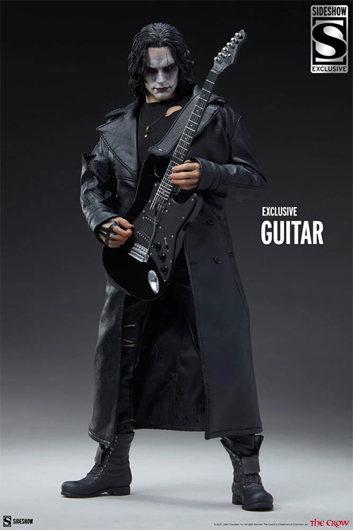 サイドショーから映画『クロウ 飛翔伝説』の主人公エリック・ドレイヴンが1/6スケールで再び。ブランドン・リーが演じるエリックを、全高約31センチ、約30箇所可動のアクションフィギュアとして立体化。特徴をとらえた長髪に白いメイクのヘッド、布製のトレンチコート、穴が開いた長袖シャツ、パンツ、ブーツなど、細部に至るまでこだわりを感じる仕上がり。リボルバー、ピストル、ショットガン、刀、多彩な差し替え用ハンドパーツに加え、エリックを導くカラスがアクセサリーとして付属。こちらは限定版となり、ストラップが付いたギターが付属し、さらにその世界観を堪能できるアイテムです。