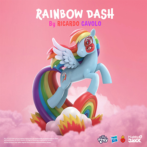 アニメ、コミック、グッズなど幅広く展開しハズブロの人気キャラクターの一つとして君臨するマイリトルポニーとナイキ、コンバースやソックスブランド「STANCE」ともコラボアイテムをリリースするなどスペインを拠点に活動するアーティスト、リカルド・カラボのコラボレーションアイテム。スポーツ万能なペガサスの女の子で誰よりも速く飛ぶことが好きなレインボーダッシュが飛行技の一つ"ソニックレインブーム"をきめた姿をタトゥーアートからも多くの影響を受けてきたリカルド・カラボがアーティスティックに描き出した作品を様々なデザイナーズフィギュアやアート作品を手掛けるマイティージャックスが立体化!