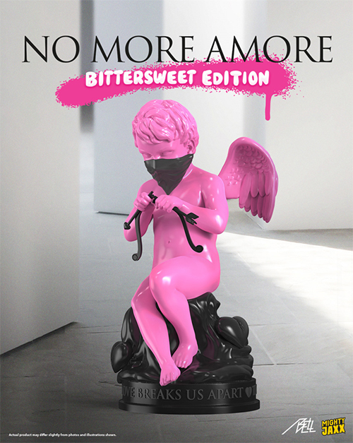 様々なデザイナーズフィギュアやアート作品を手掛けるマイティージャックスから、ジャカルタを拠点に2008年からアートトイの制作を行っている2つのキャラクターやコンセプトを組み合わせ新たな物を創造する事を得意とする、デザイナー兼プロデューサーのアベル・オクトバン。今回アンチバレンタイン作品の決定版として、この「ノー モア・アモーレ」を制作。本来、恋人同士をつなぎ合わせる役目のキューピットがバレンタインの商業化、失恋の痛ましい叫びなどに嫌気がさし、休息を願うあまり赤い矢を折る強烈な姿を立体化。ギリシャの古典的な彫刻からインスパイヤを受けた大理石の様な質感は高級感が漂います。300pcs限定アイテム。