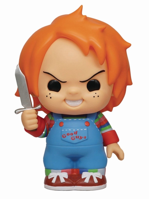 バストバンクやペーパーウェイトをリリースするモノグラムから新作が登場!映画『チャイルドプレイ』シリーズの主人公(?)、殺人鬼チャッキーがフィギュア型バンクになりました!「GOOD GUYS」ロゴ入りのオーバーオール、手にナイフ、そしてこの表情…デフォルメされていてもしっかりチャッキー。日頃からのコイン投入が楽しくなりそうな貯金箱です!