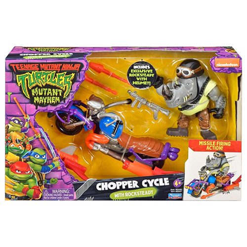 続編のアニメーションも控える、自身も俳優であり、数々のヒット作の製作にも携わるセス・ローゲンをプロデューサーに迎えたタートルズ映画『ミュータント・タートルズ:ミュータント・パニック!』から、カスタムバイクにまたがったロックステディがタートルズフィギュアを古くから手掛けるプレイメイツから、4.25インチのフィギュアとなって登場です。『ミュータント・タートルズ:ミュータント・パニック!』で特徴的だったずんぐりなロックステディのヘルメット姿も素敵です。チョッパーサイクルから発射可能なミサイル2個も付属。