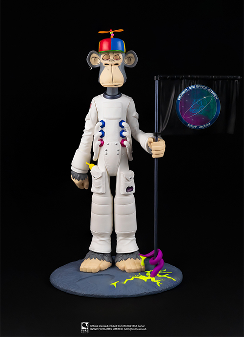 2021年から猿をモチーフにした10000個のNFTコレクションとしてスタートし、海外セレブなども所有していると言われる「BAYC(ボアードエイプ・ヨットクラブ)」。#1356のオーナーであるB$Aから正式ライセンスの許諾を得てピュアアーツがボアード・スペースエイプを全高約23センチで立体化。BAYCの特徴でもある"ボアード"が示す通り退屈そうな表情や仕草、雰囲気もしっかりと表現。ピュアアーツのBAYCコレクションには、NFCチップがベースに埋め込まれており、デジタルコレクティブルとしても所有出来るようです。