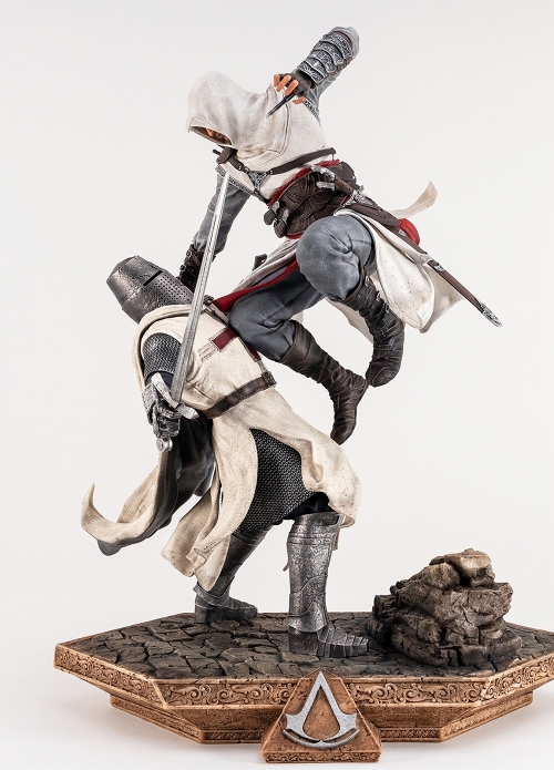 UBIソフトの誇る人気アクションゲーム『アサシン クリード』シリーズ。アルタイル・イブン・ラ・アハドのを主人公とするシリーズ1作目『Assassin's Creed』から、ピュアアーツが新作スタチューをリリースします。暗殺任務を帯びたアルタイル、標的に飛び掛かるさまを全高約44センチ、1/6スケールでダイナミックに造形。宙に浮いたように見えるアルタイルは、テンプル騎士団のロベール・ド・サブレを今にも仕留めかからんとしています。ベース部は作品の雰囲気を感じられるジオラマ仕立てに。舞台である1191年の世界観が見事に再現された至極の一品です。