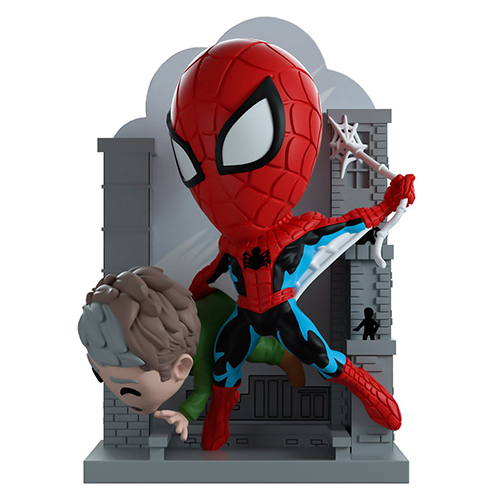ニッコリ笑顔が特徴的でアメリカを中心に新たなファン層を獲得しつつある注目のメーカー「Youtooz」から、スパイダーマンコミックスの印象的なカバーを再現したシリーズが登場です。こちらは1962年にリリースされた記念すべきスパイダーマン初登場号「Amazing Fantasy #15」をチョイス。その後、数々のアートでもオマージュされたあまりにも印象的なアートをディフォルメながら背景から片手に抱えた人まで見事に再現しています。スパイダーマンのカラーリングがコミックを意識した塗分けになっている部分にも注目です。