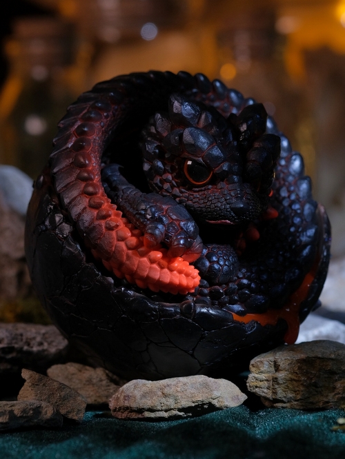 岩魁と名付けられた、アルマジロトカゲのような生き物。しかし目を凝らすと、その鱗は鉱物のようであることに気付くはず。空想の生物でありながら、この世界中を探し回ればどこかにいるかもしれない。そんな不思議な感覚に陥る魅力的なデザインと、そんな気持ちに説得力をもたらす造形は、ファンタジーとリアリティの狭間を体現したような逸品。手のひらに乗せれば、思わず鼓動を感じてしまうかも。