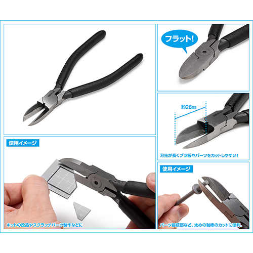 プラ板の切り出しや、パーツの切断などに便利な刃先が長めのフラットタイプニッパー(両刃タイプ)。太い軸棒などのカットにも便利で、キットの改造やスクラッチパーツ製作などに役立ちます。刃面は切り残しの少ないフラットタイプとなっております。