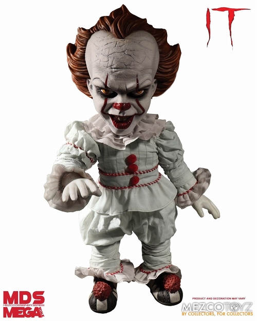 簡単なアクションポーズが可能な2~3頭身ボディ、顔はなかなかの「リアル」テイスト。そのオリジナルなデフォルメで人気、メズコのMDSメガスケールからペニーワイズ再び!映画『IT イット それが見えたら、終わり。』でビル・スカルスガルドが演じたペニーワイズを、全高約38センチの大型サイズで再現しました。デフォルメされていたとしてもペニーワイズはペニーワイズ、ひび割れた額やギラギラとした目などの頭部造型は必見です。全身数個所可動、全米をピエロ恐怖症に陥れた「クラウン」布製コスチューム、そして「You'll float too...」などのサウンドギミック6種を内蔵しました。