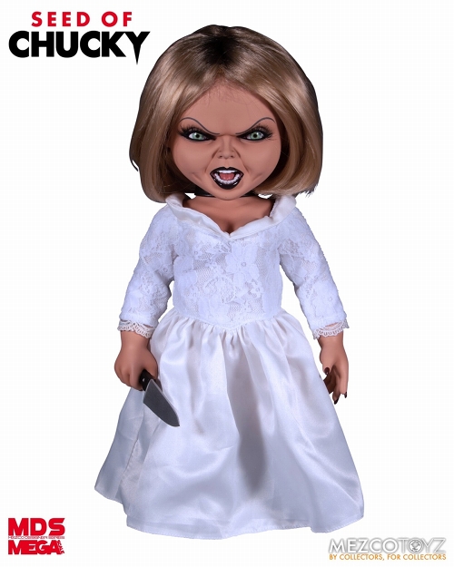 簡単なアクションポーズが可能な2~3頭身ボディ、顔はなかなかの「リアル」テイストが特徴のメズコトイズ「MDS デザイナーシリーズ」。今回、映画『チャイルドプレイ チャッキーの花嫁』から、ティファニーの人気のメガスケールが再登場となりました!全高約38センチの「メガ」版なので全身11箇所と可動域が少し多め。衣装はきれいなホワイトのドレスで、上半身部はレースで細かい模様も再現しています。ばっくり開いた胸元にはおなじみのタトゥーも。背中にボタンがあり、そこを押すことで「Hold still honey or I am going to poke you in the eye again.」や「Sweet face, come to mommy.」などのフレーズを音声ギミックとして再生!劇中から8種を採用。ナイフを握った手をよく見るときれいに整えられマニキュアされたネイル、花嫁なのでオシャレさんです。顔は鬼の表情ですが。