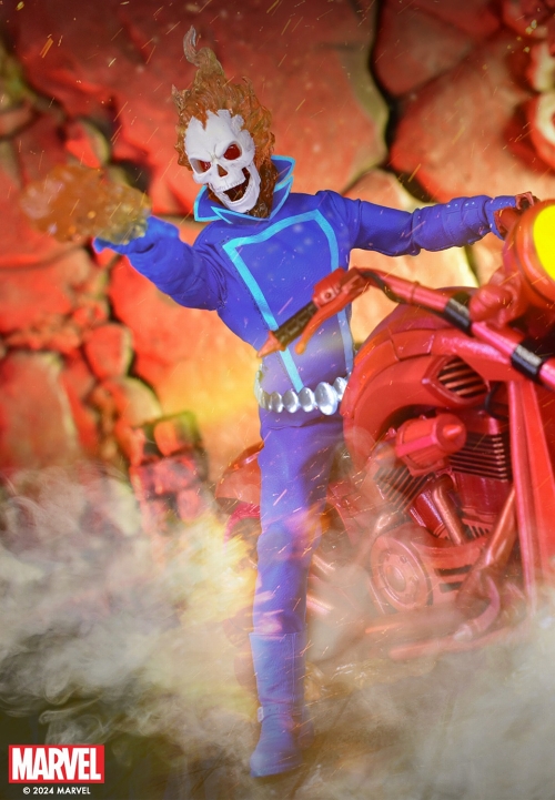 メズコトイズのプロダクトライン「ワン12コレクティブ」1/12スケールフィギュアシリーズに、マーベルコミックからゴーストライダーが流通限定で再ラインナップです!1972年の「Marvel Spotlight #5」にて初登場となったゴーストライダー、当時のコミックデザインを元に1/12スケールでフィギュア化。レザー調スーツ、ライディングブーツ&グローブと、シンプルなデザインの全体は青基調ですっきり!頭部は前回と同じく、クリア成形の炎パーツに骸骨パーツを組み込み、造型と演出を兼ねた注目ポイント。しかもLED内蔵で光るという追加要素もGOODです!ヘルバイク(ヘルサイクル)はサウンド&ライトアップのギミックを内蔵!さらにかなり思い切った業火エフェクトパーツも付属します。豪華!