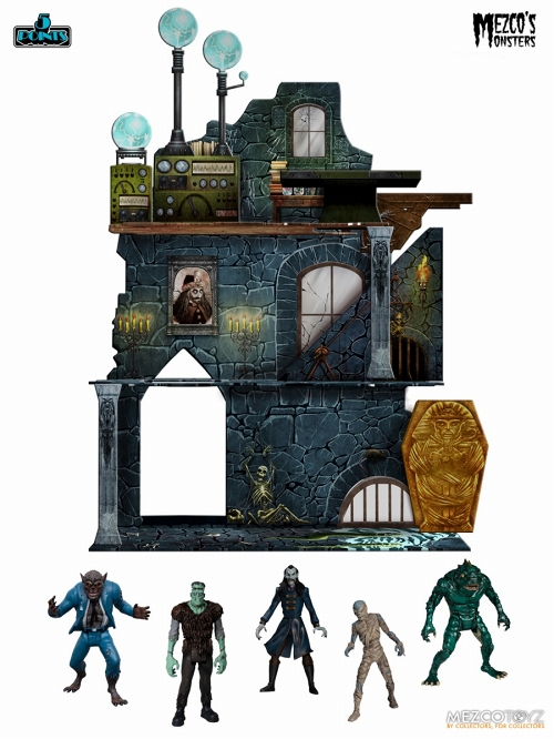 メズコトイズが放つ新シリーズ「5ポイント」!その名の通りに可動域を最小限の「5カ所」程度とし、フォルムを優先することで3.75インチが持つ独特の雰囲気を最大限に生かすシリーズです。新作としてラインナップしたのは、メズコのオリジナルホラーシリーズ「Mezco’s Monsters」!意訳すると「恐怖の塔」となった今回のセットには、狼男、フランケンシュタインモンスター、ドラキュラ、ミイラ男、半魚人という、有名ホラーキャラが揃った同窓会的ラインナップ。銀幕を彩ったホラーキャラたちにリスペクトしながらも、しっかりとメズコのアレンジが効いたデザイン!ダンジョン、メインホール、フランケンシュタインの実験室、カルパチアの城など、それぞれのキャラの舞台をミックスしたプレイセットは、なんと全高約46センチという、こっちがメインと言えるほどの超巨大サイズ。ドラキュラやミイラ男の棺や、フランケンシュタインモンスターの実験装置などのアクセサリーも付属し、妄想ディスプレイが捗る!