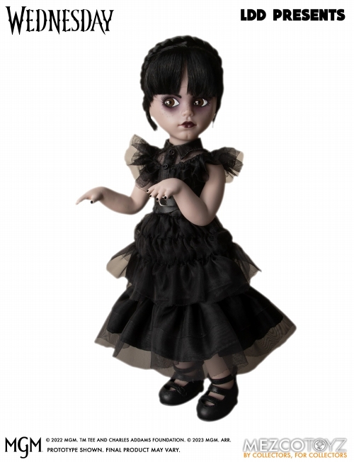 チャールズ・アダムスの漫画からのドラマ、1990年代には映画で大ヒット。さらに2019年にはアニメーション化と、マルチな展開をみせる『アダムス・ファミリー』。その最新作としてあの鬼才ティム・バートンが製作に加わり、大反響のNetflixオリジナルドラマ『Wednesday』!ジェナ・オルテガ演じる主人公ウェンズデー・アダムス、メズコの「リビングデッドドールズ」シリーズから再登場となりました。今回はジェナ・オルテガ本人が振付した「クセ強ダンス(公式命名)」な姿。チョイスまでクセが強い!LDDアレンジされつつも、「Rave'N」の際のフリルがついた黒いドレス、印象的な髪型もしっかりウェンズデー。LDDでは珍しい、ダンスを再現する腕は必見です!