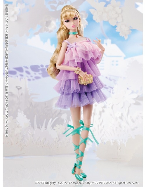 「FR Nippon Collection」シリーズの最新作としてランナップするのは「ライラックミサキ」です。甘い香りがしそうな淡いパープルの系のフリルティアードワンピは、グラディーションのきいた4枚の花びらを思わせるスタイル。ゴールドをアクセントにした春らしいファッションです。インティグリティトイズのマーク・ティンキー氏デザインのフラワーシリーズ第3弾です。