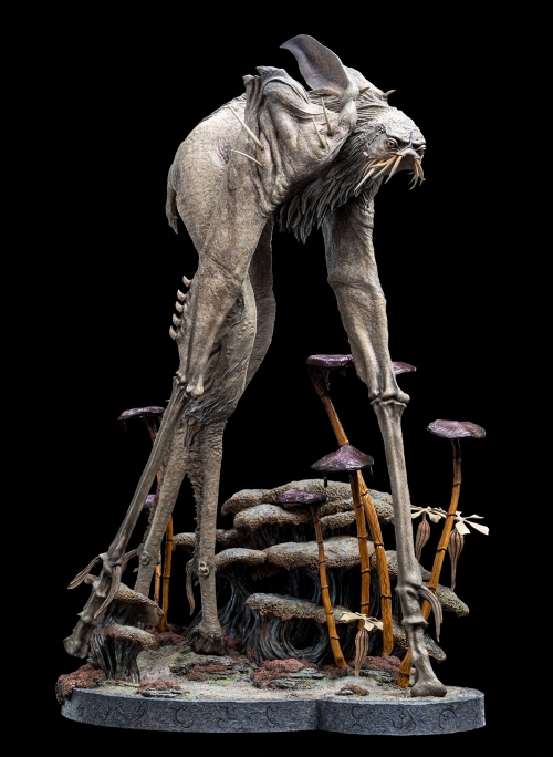 1983年に日本公開されたジム・ヘンソン&フランク・オズによる傑作ファンタジー映画『ダーククリスタル』。ダーククリスタルの城を目指すキーラが呼び出した野生の生き物、それがランドストライダー「スタニーテイマー」です。ジェンやキーラが「足」としたそのスタニーテイマーを、WETAワークショップが1/6スケールで立体化しました!ポドリン族から習得したという方法で乗り物として使うランドストライダー、見た目からは想像もつかないスピードを出す長い脚を持つ姿を、全高約49センチで再現しました。原型製作を担当したのはクリーチャー造型のエキスパートであるキム・ビートン。キノコのような植物や苔が生えた大地を模した専用ベースは、惑星トラを舞台にした『ダーククリスタル』の独特な世界観を演出します。