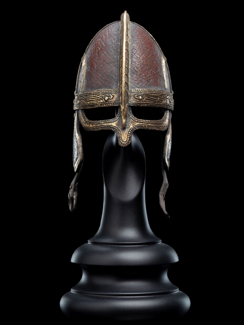 映画監督ピーター・ジャクソンらにより設立された「WETA」。『ロード・オブ・ザ・リング』をはじめ、数々の映画作品で特殊メイクやプロップ製作などを手がけてきたウェタワークショップが直々に作り上げた新作。ローハンの兵が装備するヘルメットを、1/4スケールでミニチュア化しました。シンプルな形状ながらも、装飾をこだわったようなディテール、使い込まれた汚れなどの塗装表現など、手抜きのないクオリティとなったミニチュアモデルです。