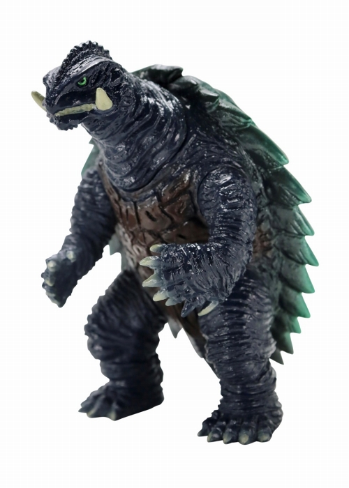 CCPミドルサイズでガメラシリーズ始動!!1996年公開の映画『ガメラ2 レギオン襲来』から1996年版のガメラを手のひらサイズに落とし込んだ、手になじむ程よいサイズ感のレトロなソフビが登場。レトロな雰囲気ながら造形面、特徴である丸みを帯びた甲羅や前傾姿勢のシルエット、表情などにもこだわりを感じます。ガメラの体表をイメージした暗いブルーの成形に、ブラウンの腹甲と、ダークグリーン・メタリックグリーンの2色を吹きかけた甲羅。ガメラらしさにあふれたスタンダードなカラーリングになっています。ヘッダーデザインは、イラストレーター八重樫紀史氏による描き下ろし。