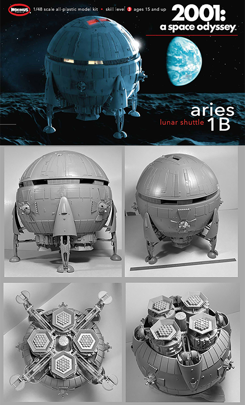 1968年に公開されて以来、映画史にその名を残す名作として名高い、スタンリー・キューブリックの映画『2001年宇宙の旅』。「ディスカバリー号」のモデルキットを手掛けたメビウスモデルから「アリエス号」の1/48スケールモデルが再び登場です。球形の形状を直径約35センチでリアルに再現。機体表面のパネル、窓や脚のディテールは、映画のプロップに基づいてデザインされ、映画そのものの雰囲気が伝わります。さらに、月面着陸時に降りる4本の脚、ランディングギア、さらに、小さな噴射口が集合したエンジンの噴射口部分も繊細に表現。メカニカルな仕上がりが楽しめます。各部のディテールを生かして、強調する塗装、汚し塗装などに腕をふるってみるのも、あるいは大きなモデルだけに電飾などに挑戦してみるのも良いでしょう。