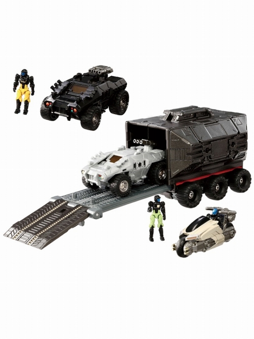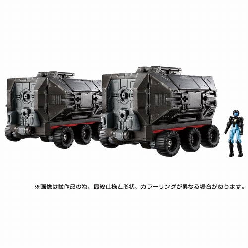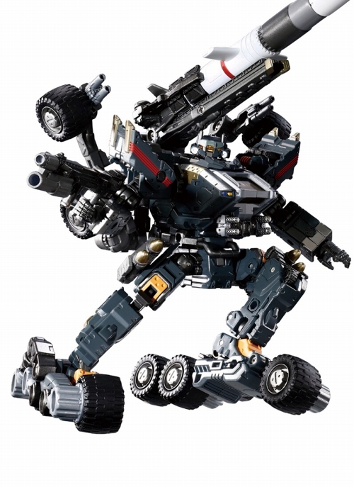 マシン前部は4輪ビークルを構成!マシン後部は6輪ローラー走行ユニットとして機能。シリーズ最長の長さを誇るミサイルを搭載。ボディーカラーはブラックグリーン。ダイアクロン隊員Ver.2.0が1体付属。