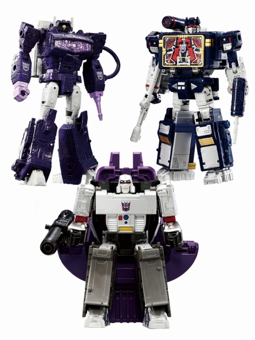 ディセプティコンの宇宙戦艦ネメシスのブリッジにあるキャプテンシートに鎮座するディセプティコンの破壊大帝メガトロンと、その両脇を固める幹部2名ショックウェーブとサウンドウェーブをイメージしたスペシャル情景セットです。ジェネレーションシリーズで使用された最新の金型を使用して、カラーリングはプレミアムフィニッシュ仕様で仕上げました。メガトロンはメタリック感をUPさせたシルバー塗装仕上げに、ショックウェーブはシージ版からよりアニメーション本編のカラーイメージに変更、サウンドウェーブもシルバー塗装とポイントとなる赤色塗装を増やしてリアルガジェット感を演出、胸部に収納可能なレーザービークが1体付属します。そしてメガトロンが座すキャプテンシートが、より臨場感を演出し、ネメシスの艦橋での彼らの活躍を想像させます。