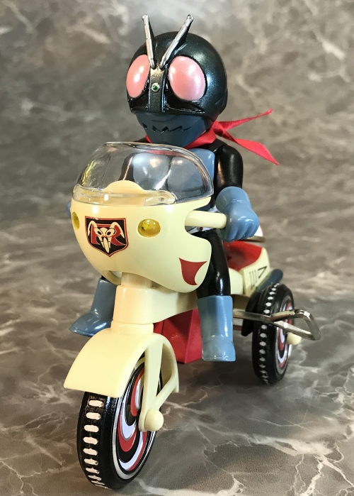 『仮面ライダー』に登場するキャラクターたちが、懐かしくレトロなゼンマイ式三輪車に乗ったソフビフィギュアで登場!その第1弾として、「仮面ライダー旧1号」がリリースです。デフォルメもキュートなフィギュアながらも、そのキャラクターの特徴を手袋やブーツなど細部の造型で表現されています。「仮面ライダー」は襟足の髪型も再現し、真紅のマフラーは布で再現。三輪車はゼンマイを回し走行が可能。車輪も可動。おりん部分がチリンチリンと音が鳴ります。前輪の角度を変えることにより、進行方向を変更できます。三輪車の本体、ホイールやおりん等もそれぞれのキャラクター用のカラーリング、そしてカウルやマフラーにライトパーツなど、細かい造形がファンを魅了します。