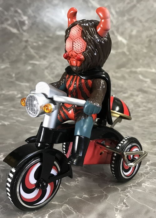 アニメや特撮のキャラクターたちが懐かしく、レトロなゼンマイ式三輪車に乗ったソフビフィギュア「ES三輪車」シリーズ。カウルやマフラーパーツなどのソフビならではの造型はもちろん、三輪車のホイールや後部の「おりん」などは各キャラのカラーリングを採用するなど、こだわりの仕上がり。車輪も可動式で、ゼンマイを回しての走行が可能です。おりん部もしっかりチリンチリンと音が鳴る!こちらは永井豪氏の傑作『マジンガーZ』から、「鉄の城」マジンガーZです。