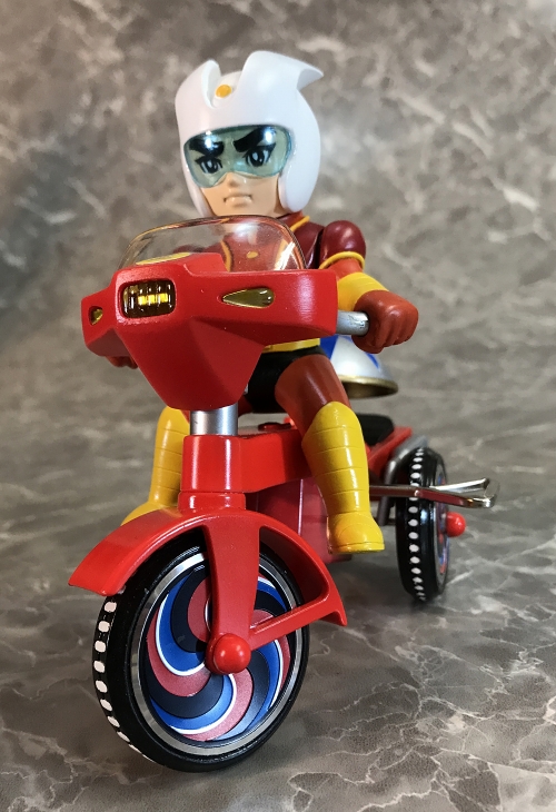 アニメや特撮のキャラクターたちが懐かしく、レトロなゼンマイ式三輪車に乗ったソフビフィギュア「ES三輪車」シリーズ。カウルやマフラーパーツなどのソフビならではの造型はもちろん、三輪車のホイールや後部の「おりん」などは各キャラのカラーリングを採用するなど、こだわりの仕上がり。車輪も可動式で、ゼンマイを回しての走行が可能です。おりん部もしっかりチリンチリンと音が鳴る!こちらは永井豪氏の傑作『マジンガーZ』から、パイロット兜甲児です。