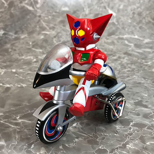 アニメや特撮のキャラクターたちが懐かしく、レトロなゼンマイ式三輪車に乗ったソフビフィギュア「EX三輪車」シリーズ。カウルやマフラーパーツなどのソフビならではの造型はもちろん、三輪車のホイールや後部の「おりん」などは各キャラのカラーリングを採用するなど、こだわりの仕上がり。車輪も可動式で、ゼンマイを回しての走行が可能です。おりん部もしっかりチリンチリンと音が鳴る!永井豪氏の傑作『ゲッターロボ』から、ゲッター1が仲間入り。