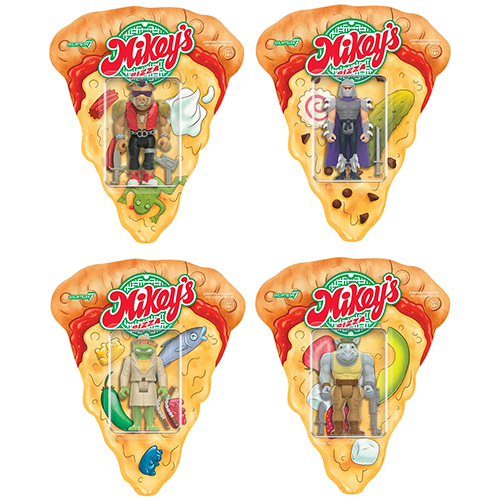 スーパー7の手掛けるリアクションシリーズからSDCC2024限定アイテムとして、1987年のタートルズアニメシリーズからシーズン3のエピソード「Pizza by the Shred」からインスパイアされたアイテムが登場です。ミケランジェロがCMを見てお忍びでピザを買いに行くピザ店「Weird Pizza to Go」。お忍び姿のミケランジェロと「Weird Pizza to Go」を運営するビーバップ、ロックステディ、シュレッダーが、それぞれ"とんでもピザ"の限定バックカードになったスペシャルなアイテム。