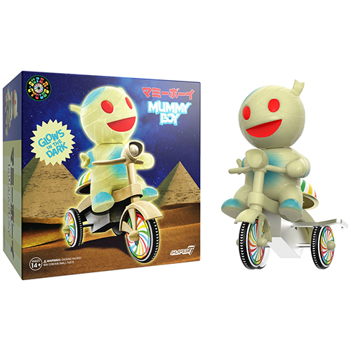 懐かしき70年代ごろに日本で特撮やアニメキャラクターを乗せたブリキ製の三輪車のおもちゃがリリースされていましたが、そんなスタイルをオマージュしたスーパー7の新シリーズ「スーパーサイクルズ」が誕生!こちらは、スーパー7を代表するオリジナルキャラクター、「マミーボーイ」!もはやライト要らずな、暗闇の中で光り輝く「グロウ ver.」。運転席だけでなく、身体まで光らせる姿がとってもプリティ。当時のベルもしっかりとオマージュされレトロ感漂う素敵なアイテムになっています。