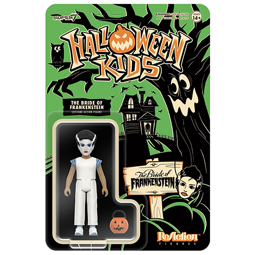 70~80年代にアメリカのハロウィンでオーソドックスだった"お面と簡易コスチューム"に身を包んだ子供たちからインスパイアされたスーパー7のリアクションフィギュアシリーズ「ハロウィンキッズ」。こちらは、ハロウィンの大本命ユニバーサルモンスターズから、フランケンシュタインの花嫁ブライドのマスクと簡易コスチュームに身を包んだハロウィンキッズ。