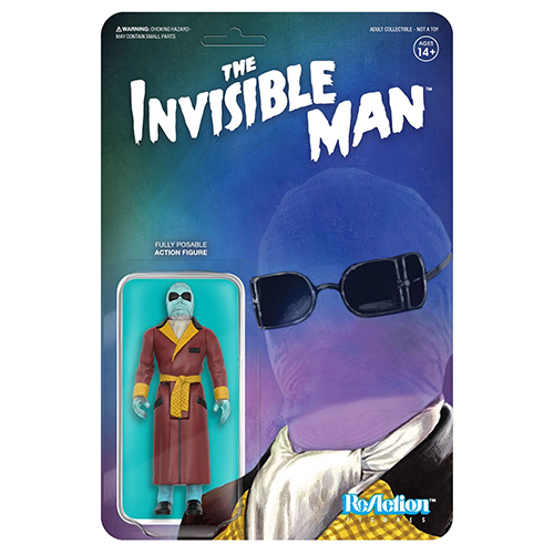 スーパー7のリアクションシリーズが持つ、そのレトロな雰囲気と相性抜群な1930年代を中心に銀幕を彩った名怪物たち「ユニバーサルモンスターズ」。1933年にH・G・ウェルズの小説を元に制作された映画『透明人間』より透明人間となったジャック・グリフィン博士を、クリア素材を使用し透明感を再現したクリアver.が新たに登場です。