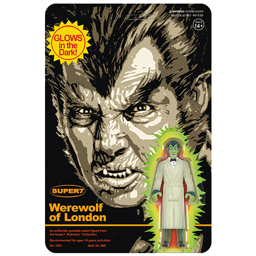 フィルムが現存する中で最古の狼男ムービーと言われている1935年の映画『倫敦の人狼』から、ヘンリー・ハル演じる狼に噛まれ"狼憑き"となってしまったグレンドン博士の姿のリアクションフィギュアが、スーパー7ではお馴染みとなった、今は無きメーカー「レムコ」が1980年にリリースしていた「Glow in the Dark Mini Monster」をリスペクトしたバックカード&蓄光仕様で再び登場!モンスター史に残る狼男とレムコオマージュの共演…最高です!