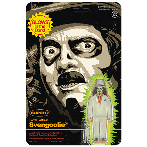 40年以上もの間、土曜の夜にジョークやパロディソングを交えてホラー映画ファンを楽しませているホラー映画紹介番組「スヴェングーリー」。その番組のホストであり名物キャラクター、スヴェングーリーのリアクションフィギュアが、スーパー7ではお馴染みとなった、今は無きメーカー「レムコ」が1980年にリリースしていた「Glow in the Dark Mini Monster」をリスペクトしたバックカード&蓄光仕様で再び登場!モンスター史に残る狼男とレムコオマージュの共演…最高です!