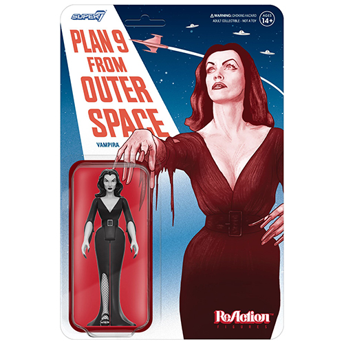 仮面舞踏会に『アダムスファミリー』のイメージしたドレスで参加した事をきっかけに『ヴァンパイラ・ショー』のMCに抜擢された、メイラ・ヌルミ演じる元祖ホラークイーン、ヴァンパイラが、1959年の映画『プラン9・フロム・アウタースペース』にてベラ・ルゴシ演じる老人の妻として登場した姿からインスパイアを受け銀幕仕様のグレイスケールのカラーリングでリアクションフィギュアとなって登場です。このマニアックな仕様はスーパー7ならではのこだわりのアイテム。