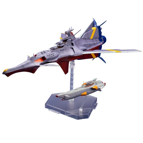 テレビアニメ『ふしぎの海のナディア』より、幻の発掘戦艦「N-ノーチラス号」が、「ノーチラス号」とのセットとしてコトブキヤから再登場!旧タルテソス王国地下に眠っていた古代アトランティス人の宇宙船、正式名称「第四世代型超光速恒星間航行用超弩級万能宇宙戦艦ヱクセリヲン」をネモ船長以下ノーチラス号の元乗組員たちが復活させた宇宙戦艦。作中で印象的なアイコンであるブルーウォーターを台座としてあしらい、主翼、副翼、垂直尾翼を後部ブースターを回転させる事で連動して展開/収納する事が可能です。さらに、セットとして付属されるノーチラス号は設定や劇中の形状を検証し、さらに一部にオリジナルのディテールを追加して、シャープなイメージで立体化。キットの成型色は5色で色分けされており、設定に近い配色で組み立てが可能。飛行爆雷のランチャーベイは、ハッチの展開状態をパーツの差し替えにて再現しています。