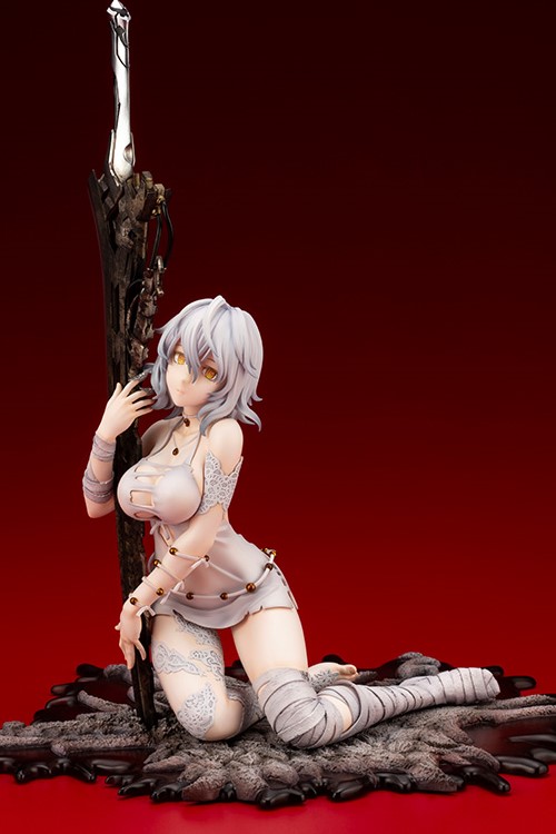 大人気ゲーム『CODE VEIN』より、バディキャラクターの「イオ」がコトブキヤの「ARTFX J」シリーズに再登場!血の表現をより現実的な色味にするためにクリアベースを使用するなど細部まで作りこまれた台座は、崩壊した世界を舞台にしたダークな世界観を見事に演出。ゲーム内のフィールドをそのまま切り取ったかのような出来栄えになっています。また、イオが寄り添っている「主人公の片手剣」もリアルさを追求。使い込まれた黒錆びの表現はまるで本物の金属と見間違えるほど。台座や片手剣同様、イオの包帯や手足の表現にもリアルさを追求し、足の指先の動きや手の甲の骨ばった表現は、本当に生きているかのような仕上がりになっています。是非現物にてご堪能ください。