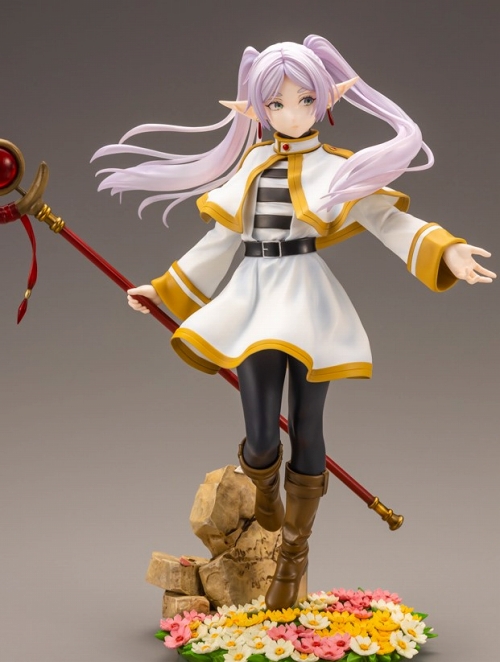 大人気TVアニメ『葬送のフリーレン』より、主人公「フリーレン」がコトブキヤから全高約24センチ、1/7スケールで立体化です。彼女の透き通るような美しい髪はクリアパーツにて再現。衣装や杖の細部に至るまで、丁寧に造形されています。フリーレンをディスプレイする台座は花畑をイメージ。美しいフリーレンをより引き立てる、とても華やかなフィギュアとなりました。