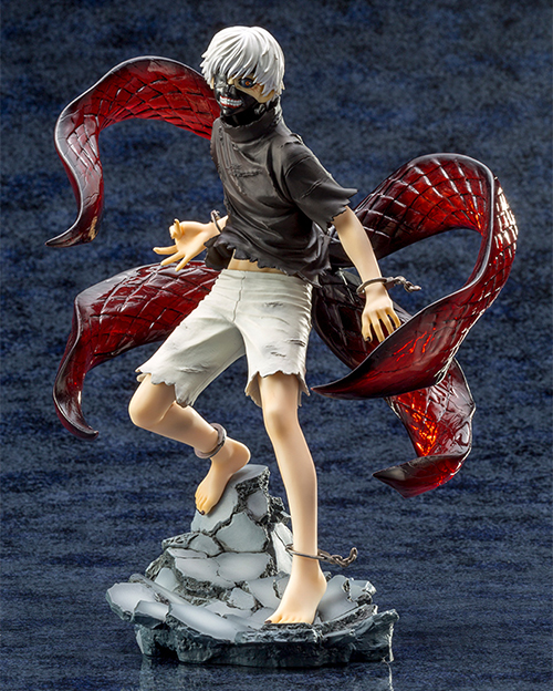 週刊ヤングジャンプの連載で着実に人気を集め、2014年から2015年にかけてのアニメ放映でブレイクした『東京喰種トーキョーグール』より、主人公であり半喰種の「金木研」の赫子(かぐね)がリペイントされたver.が再び登場。作中における様々な経験と葛藤の末、喰種としての自分を肯定し受け入れた「カネキ」の躍動感溢れるポーズ、造形で感じられるアイテム。赫眼のみを覗かせ、表情を伺わせない特徴的なマスクと背中で赤黒く光る赫子が「カネキ」の存在感を不気味なまでに引き立たせます。
