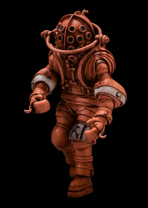 造形作家・竹谷隆之氏が中心となって立体化していく、千値練の「タケヤ式自在置物」シリーズ。現在においてもほとんどが未知の領域である深海。これまで数えきれない人類がそこに到達したいと願い、その探究心を実体化した様々な「潜水服」をタケヤ式自在置物「VINTAGE DIVING SUITS COLLECTION」としてアクションフィギュア化です。第1弾は1880年代にフランスでカルマニョール兄弟によって開発された潜水服を重厚感溢れる塗装で再現。その独特のフォルムと実際に人間が中に入ることを想定した設計はまるでパワードスーツの祖先であるかのよう。頭部に配置された10個のレンズ部分はクリアパーツを使用し魅力ある造形になっています。各関節はできるだけシンプルな構造にしながらも、幾重にも重なり複雑に連動する可動イメージを再現しました。潜水服が持つ金属的な重量感と無骨なプロダクト感、それでいてどこか愛らしくもあるデザインは、普遍的な魅力を放ちます。付属の専用台座で博物館展示のようなディスプレイも可能です。こちらは竹谷隆之初の作品集『漁師の角度』の別譚「アトゥイコロカムイ」で確認できるカラーリングをフィーチャーした、限定1000個の竹谷カラーバージョン。