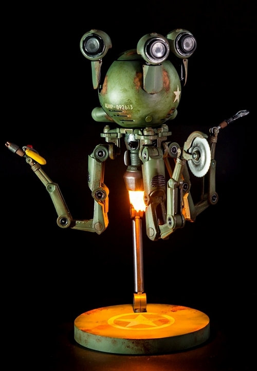 ベセスダソフトワークスによる『フォールアウト』シリーズから多数の立体化をすすめてきたゲーミングヘッズ。『フォールアウト』シリーズでおなじみとなるお手伝いロボット「Mr.ハンディ」に続き、その軍事用モデルとして生産された「Mr.ガッツィー」がフィギュア化です。全高約30センチのサイズに、全身40ヶ所の可動ポイントのアーティキュレートフィギュアとしてリリースされるガッツィー。ボール型の頭部は回転し、3つのメインカメラ部には開閉ギミックが内蔵。可動部の充実もさることながら、ブースター部のLEDライトアップ、ゲーム中のセリフ再生(もちろん英語)なども搭載されるなど、スタチュー系が多いゲーミングヘッズのラインナップでは珍しい「遊べるフィギュア」となりました。ミリタリーテイスト全開なカラーリングも最高にCOOL!