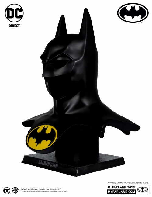 高い造形力とクオリティーに定評のあるマクファーレン・トイズがお贈りするブランド「DCダイレクト」より、1989年の映画『バットマン』でバットマンが身に着けている「カウル」がPVC製1/1スケールレプリカとして登場!台座含む高さ約62cmと1/1スケールならではの迫力も充分!特徴的なイエローとブラックのアイコンも魅力的。パッケージは、クローズドボックス仕様。