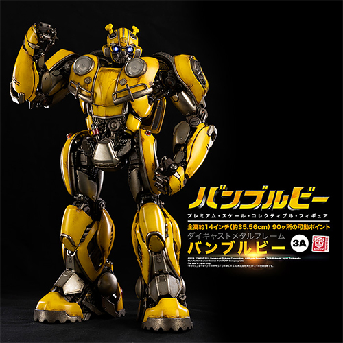 映画『バンブルビー』版バンブルビーの全高約35cmを超える、フル可動ハイエンドフィギュアが、threezeroより再び登場!「DLXスケール・バンブルビー」フィギュアよりの約1.75倍の全高を誇り、ダイキャストメタル製フレームを採用し、この大きさならではの細かいディテールや、多くの可動部位を実現。全身の可動ポイントは90ヶ所にのぼり、指は各関節が可動します。また、腹部カバーはスライドして内部のカセットプレイヤーのディテールを露出可能。目、ヘッドライト、およびスティンガーブラスターにはLED発光機能を搭載(電池別売り)し、目の発光は通常の青色と反撃モード時の赤色とで切り替え可能。ヘッドパーツの交換によってバトルマスクの有り/無しを再現。右前腕部はスティンガーブラスターと差し替え可能。他にも豊富な付属品で様々なシーンを演出することが出来るコレクティブルなアイテム。