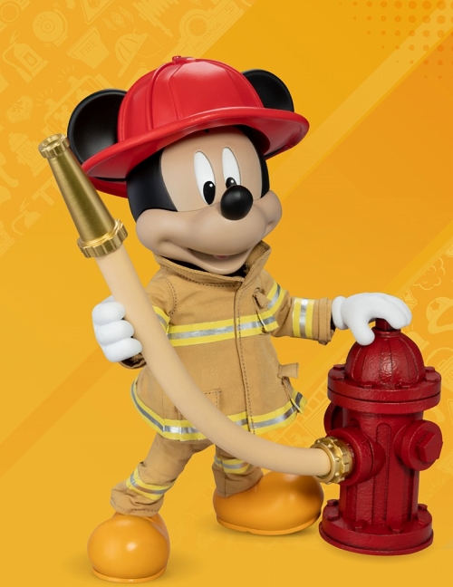 台湾ビーストキングダムによる「ダイナミックアクションヒーローズ」シリーズに、『ミッキー&フレンズ』から、消防士になった「ミッキーマウス」が全高約17センチのアクションフィギュアとして登場!布製の防火服や赤いヘルメットなど、ディテールや質感を細部まで再現しています。ヘルメットは着脱が可能。ヘッドはフェイスパーツが2種と、眼部パーツが4種付属するので、差し替えることでさまざまな表情を演出できます。アクセサリーとして、着脱可能なゴーグル、消火器、ホース、無線機が付属。同シリーズの「消防士ドナルドダック(別売)」に付属する斧やハンマーを使うなど、お互いのアクセサリーで遊べます。