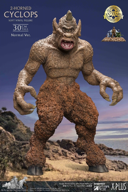 ストップモーションアニメの巨匠レイ・ハリーハウゼンが手がけた一つ目巨人「サイクロプス」。ドラゴンと死闘を繰り広げるあの銘シーンが印象的な2本角スタイルのサイクロプスがスターエースソフビスタチューシリーズに新登場!1本角のサイクロプスとは異なる内部の金属関節(アーマチュア)が使用され、少しずんぐりした体型が特徴的であった2本角のサイクロプスを、約30センチサイズのソフビスタチューで再現。顎の開閉と眼球の可動ギミックが仕込まれ様々な表情を楽しむことができます。迫力の造型をぜひご堪能ください!