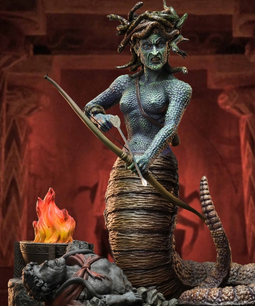 ストップモーションアニメの巨匠、レイ・ハリーハウゼンによって生み出された蛇女「メデュ―サ」。1981年公開の映画『タイタンの戦い』で活躍した名モンスターが、スターエーストイズからソフビキットとして登場です。眼光で見るものを石に変える魔力を持つメデュ―サを、弓矢を手に持った臨戦態勢で造形。映画史に残る名場面が、全高約32センチのソフビキットとして蘇りました。