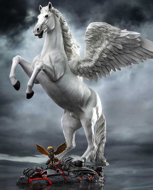 ストップモーションアニメの巨匠、レイ・ハリーハウゼンが創造したキャラクター「ペガサス」。1981年公開の映画『タイタンの戦い』に登場した「天馬」ペガサスのポリレジンスタチューが新規造形でラインナップです。今回のver.2.0では、羽根一枚一枚を丁寧に造形し、劇中イメージ通りのペガサスを再現。前脚を上げ、今にも飛び立たんとする迫力の姿が全高約45センチで立体化されました。DX版では、ミニサイズの機械式のフクロウ「ブーボ」が付属。さらに、ジオラマベースが発光式となり、鮮やかな情景をお手元で再現できます。