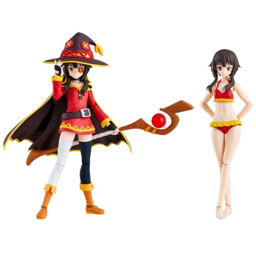 オプションパーツ: 「帽子」、「マント」、「手首パーツ3種」、「水着用手首パーツ3種」、「めぐみんの杖」、「ちょむすけ」、「ディスプレイ用台座」(「めぐみんの杖」には、爆裂魔法発動時を再現可能な交換用の「マナタイト 紫」パーツも付属)